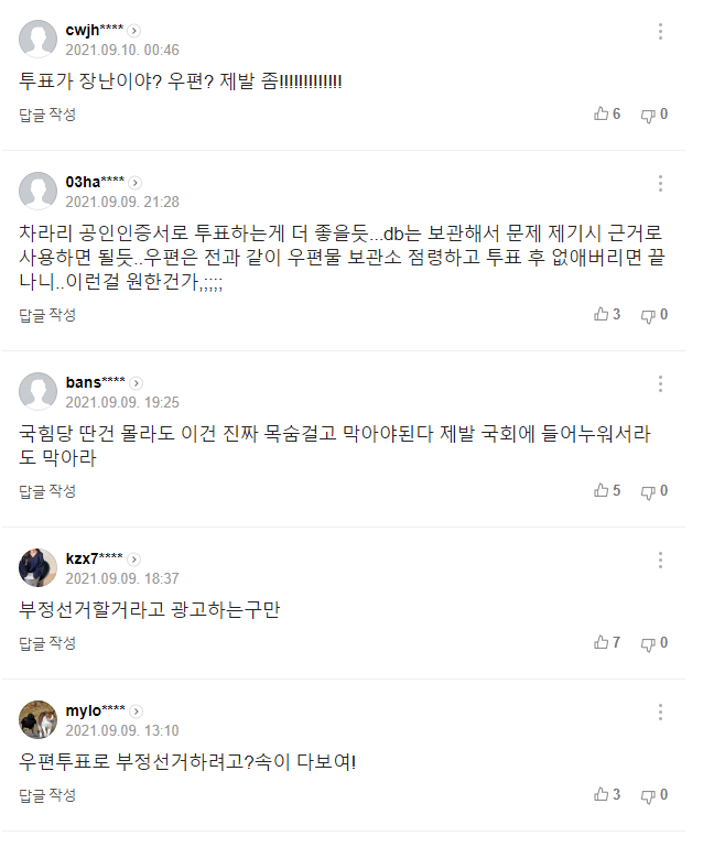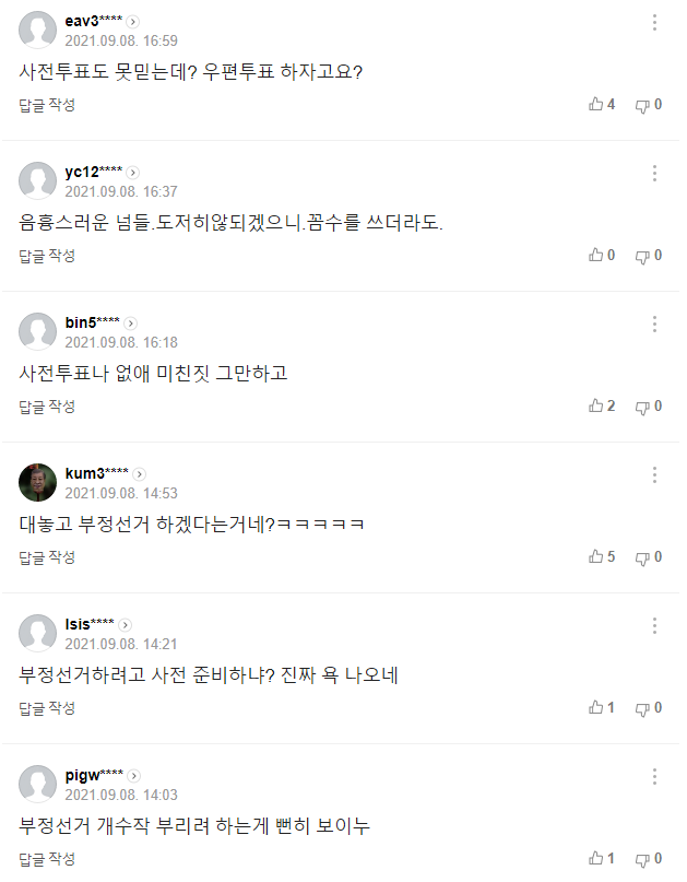 출처- https://n.news.naver.com/article/comment/448/0000338542미국의우편투표, 한국의 사전선거는 부정선거를 만들어왔다는 여러 정황이 있는데 제도를 개선하지도 않고 오히려 부정선거를 더 쉽게 할 목적을 계속 보이며 우편투표제를 도입하려고 한다. 앞으로 있을 대선에도 부정선거를 저지르기위해 준비중 인것이 분명하다!