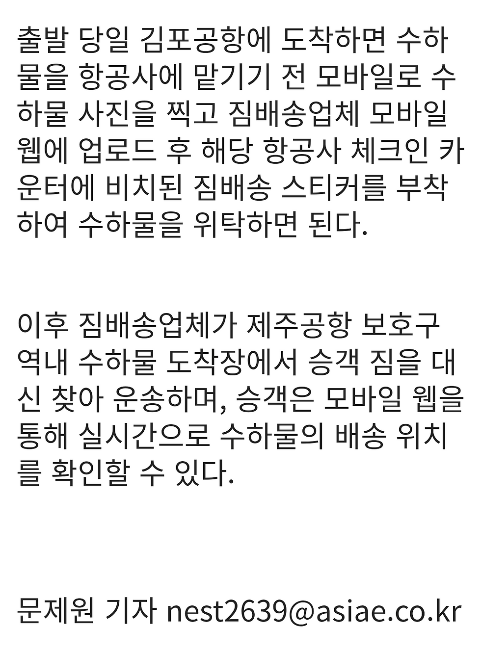 m.news.nate.com김포공항에서 보낸 짐, 제주도 숙소에서 바로 찾는다김포공항에서 짐을 부치치면 예약한 제주도 숙소에서 바로 수령할 수 있는 서비스가 도입된다. 승객은 공항에서 짐을 찾을 필요 없이 '빈손 여행'을 하다가 숙소에서 짐을 찾으면 된다.국토교통부와 한국공항공사는 6개 국적 항공사와 협업해 새로운 방식의 '짐출처:네이트온 펀