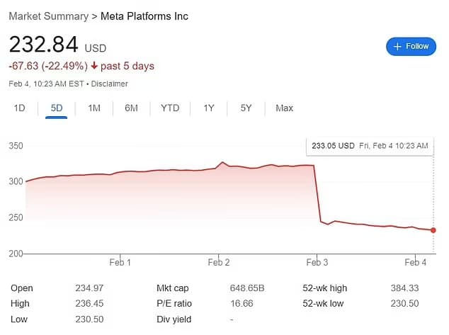 메타주식은 회사가 처음으로 일일 사용자 감소 보고를 한 후 목요일에 26%급락하여 금요일 오전 거래에서 1.5% 더 하락했다. 저커버그의 순자산은 수요일 페이스북 분기보고서 이후 약 300억 달러가 급감하였고 금요일 마감 종소리 이후 포브스 억만장자 랭킹 상위 10위에서 12위로 밀려났다.