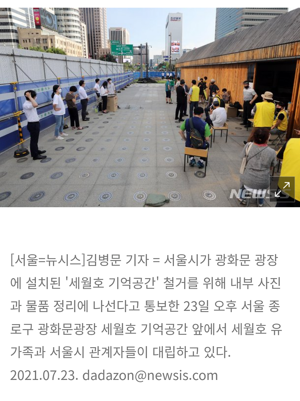 m.news.nate.com"세월호 기억공간 철거 중단"…인권위에 긴급구제 신청[서울=뉴시스]김병문 기자 = 서울시가 광화문 광장에 설치된 '세월호 기억공간' 철거를 위해 내부 사진과 물품 정리에 나선다고 통보한 23일 오후 서울 종로구 광화문광장 세월호 기억공간 앞에서 세월호 유가족과 서울시 관계자들이 대립하고 있다. 2021출처:네이트 판