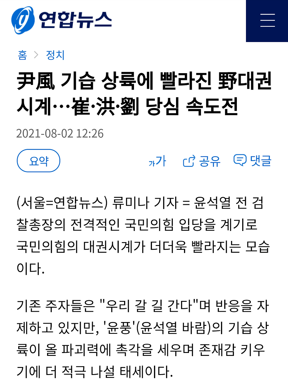 m.yna.co.kr尹風 기습 상륙에 빨라진 野대권시계…崔·洪·劉 당심 속도전 | 연합뉴스(서울=연합뉴스) 류미나 기자 = 윤석열 전 검찰총장의 전격적인 국민의힘 입당을 계기로 국민의힘의 대권시계가 더더욱 빨라지는 모습이다.출처:연합뉴스